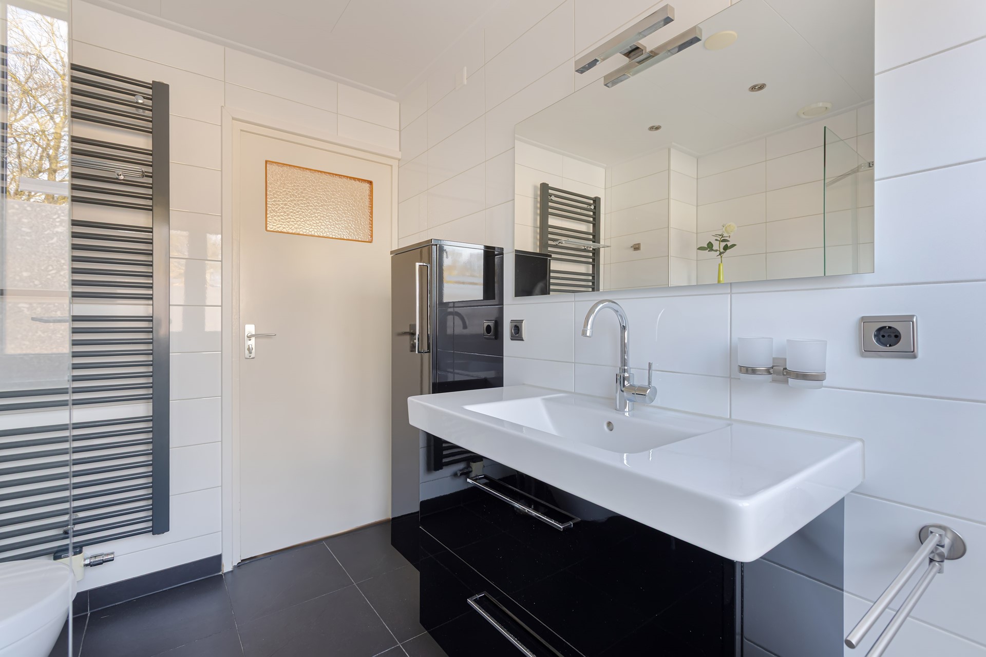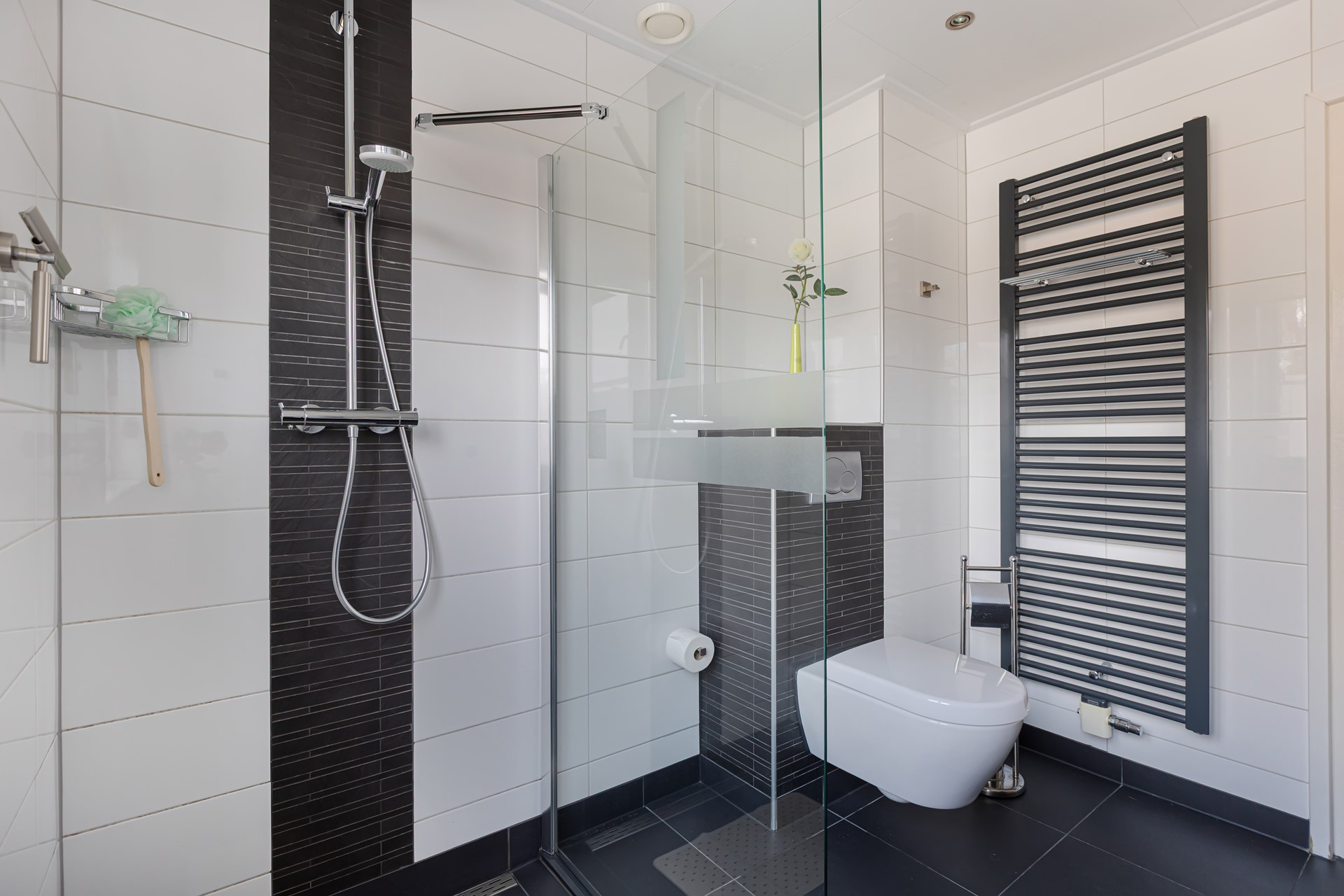 Op de eerste verdieping bevinden zich twee ruime slaapkamers met vaste kasten en een derde slaapkamer met toegang tot het platte dak, waar de mogelijkheid bestaat om een dakterras te realiseren. De moderne badkamer is uitgerust met een inloopdouche, toilet, badkamermeubel, vloerverwarming en een verwarmde spiegel.