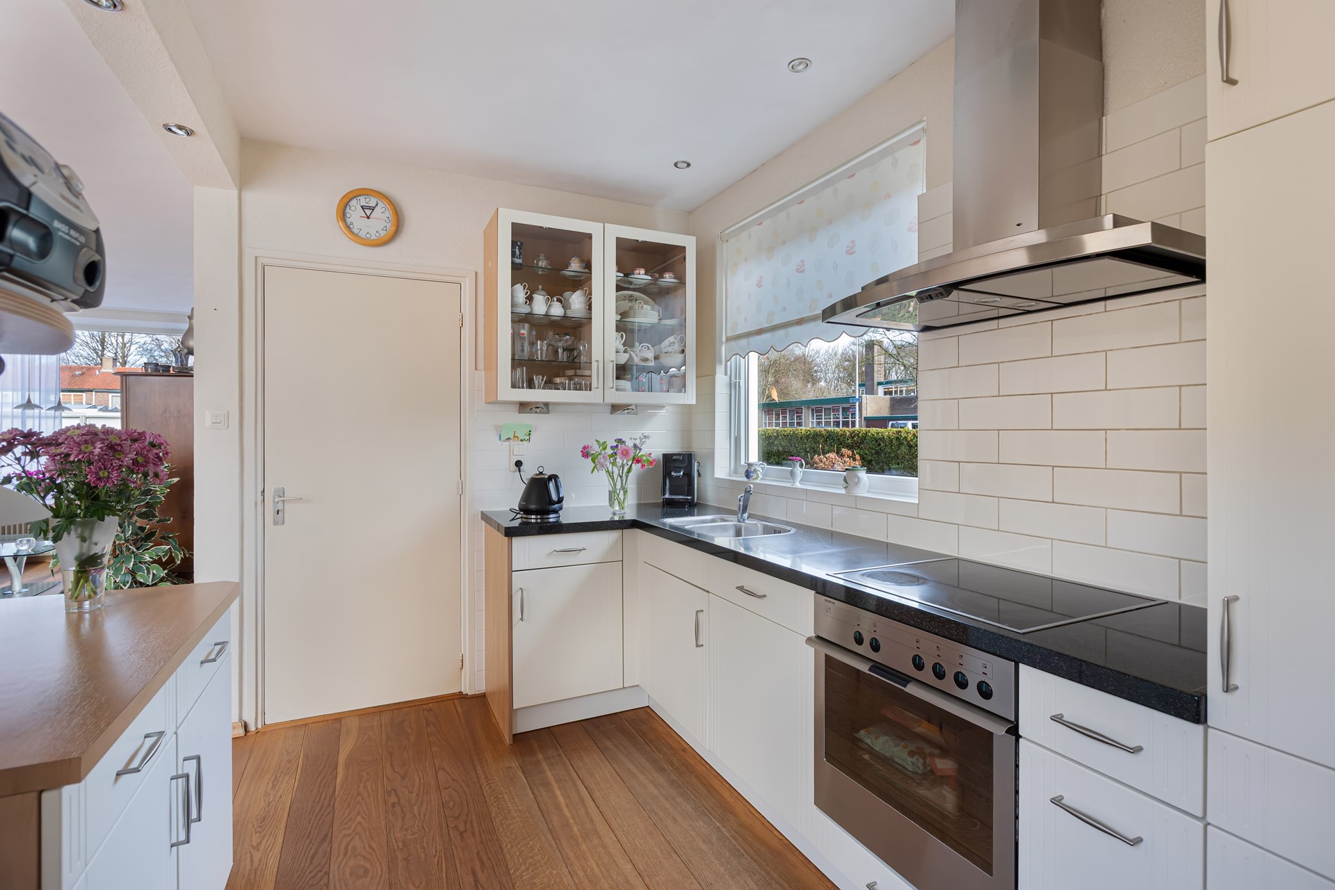 De keuken is compleet ingericht en voorzien van een koelkast, keramische kookplaat, oven, magnetron, vaatwasser en afzuigkap. Het natuurstenen aanrechtblad geeft een luxe uitstraling. Aansluitend bevindt zich de bijkeuken: een praktische extra ruimte met een keukenblok, wasmachine- en drogeraansluiting en een deur naar de achtertuin.