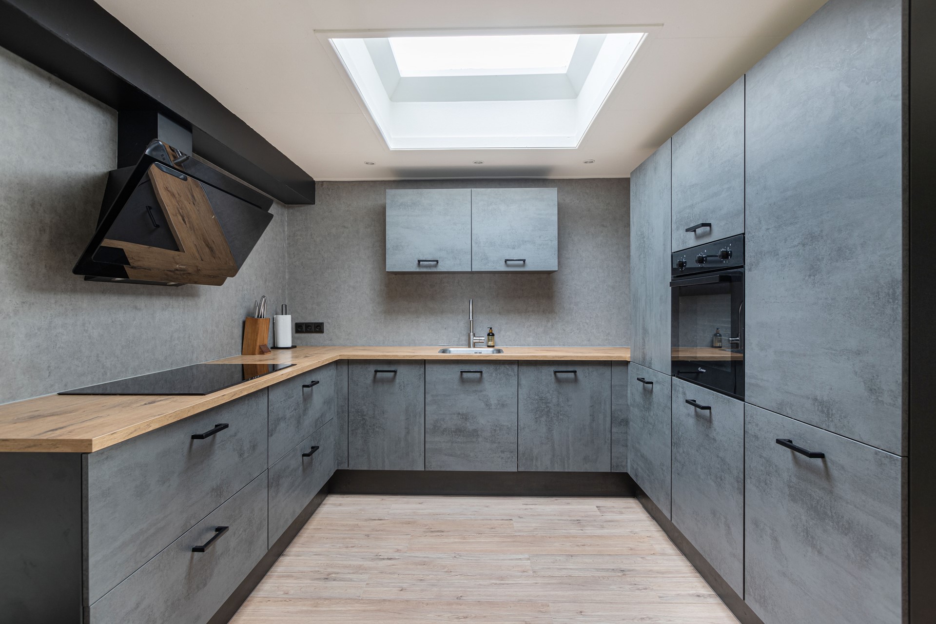 - Moderne keuken met lichtkoepel, openslaande deuren naar het terras met plissé hordeuren, inductiekookplaat, koelkast, vriezer, oven en vaatwasser