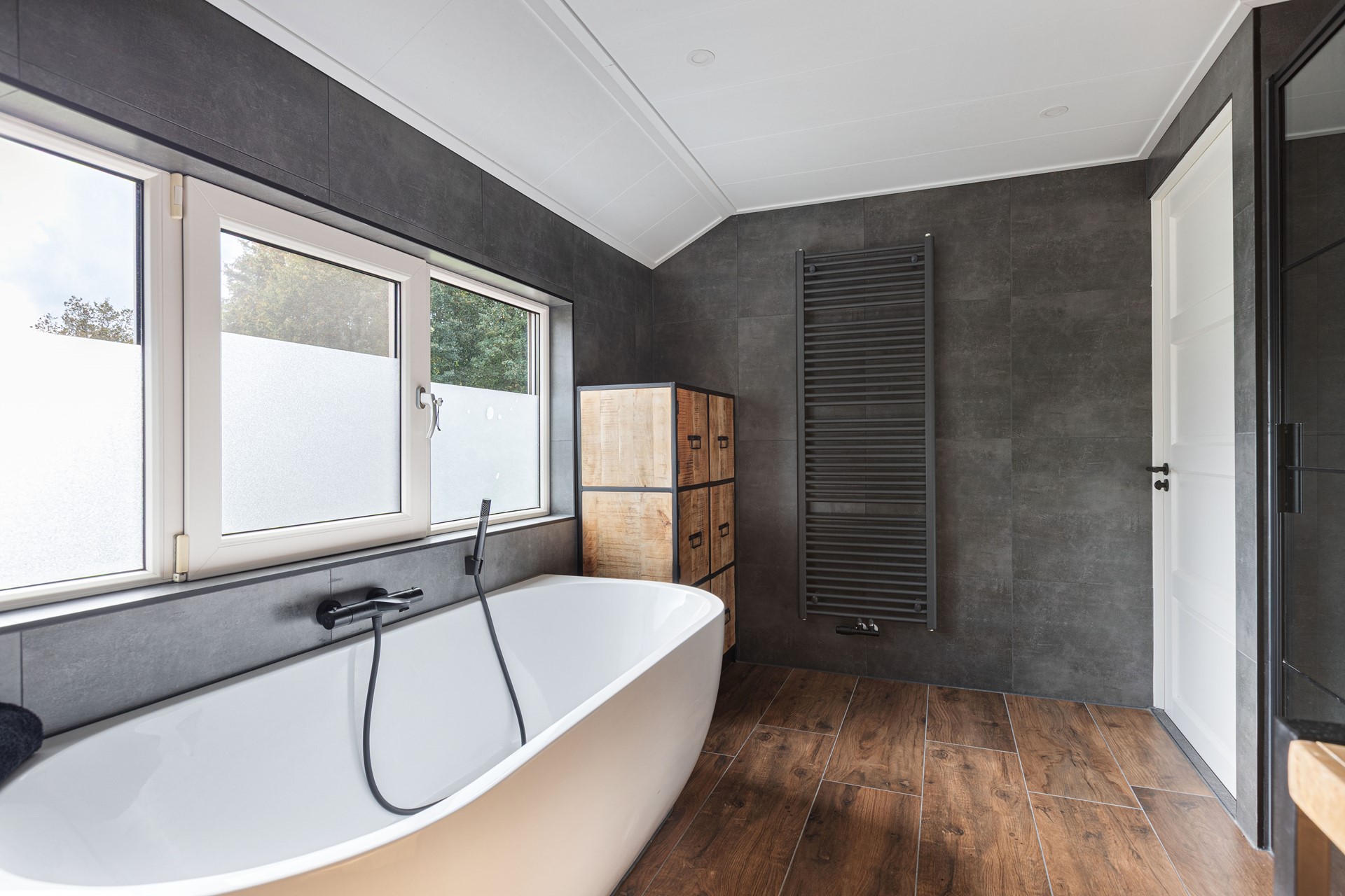 - Moderne badkamer met dakkapel met elektrisch rolluik, douche, ligbad, dubbele wastafel met meubel, toilet, designradiator