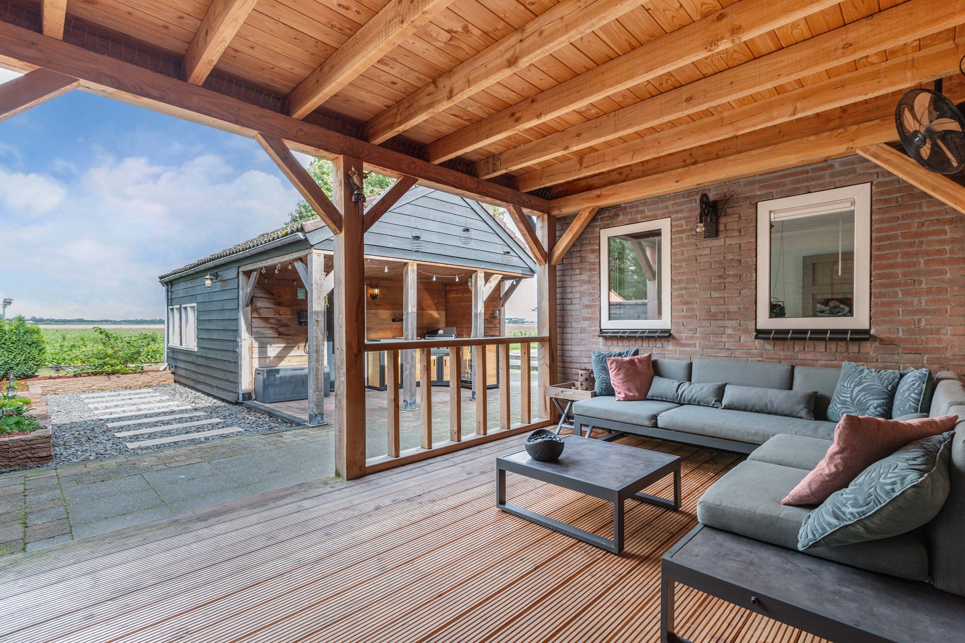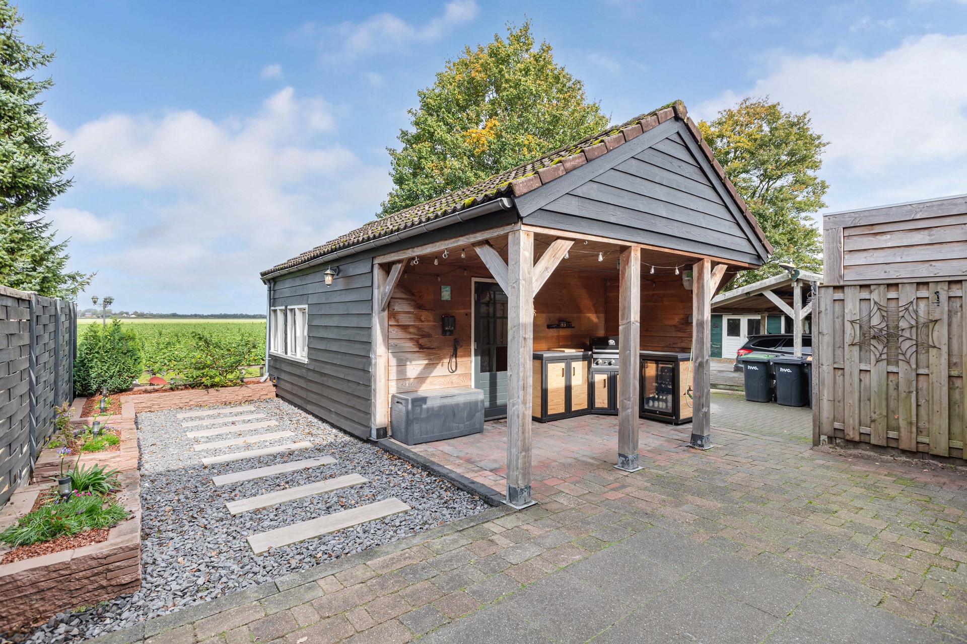 - Vrijstaande garage met kap, elektrische kanteldeur en aangebouwde overkapping met buitenkeuken.
