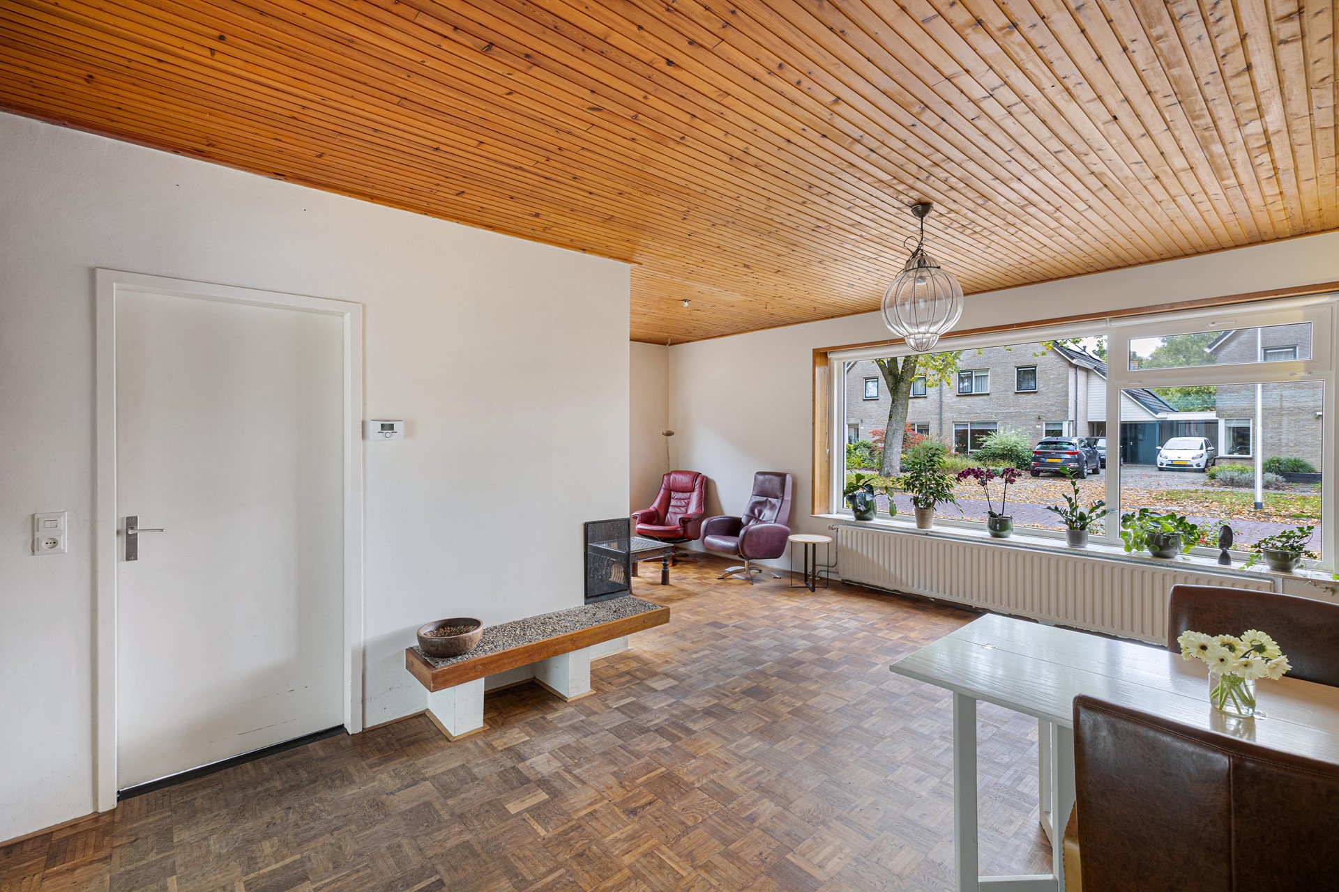 - L-vormige woonkamer met haard en parketvloer