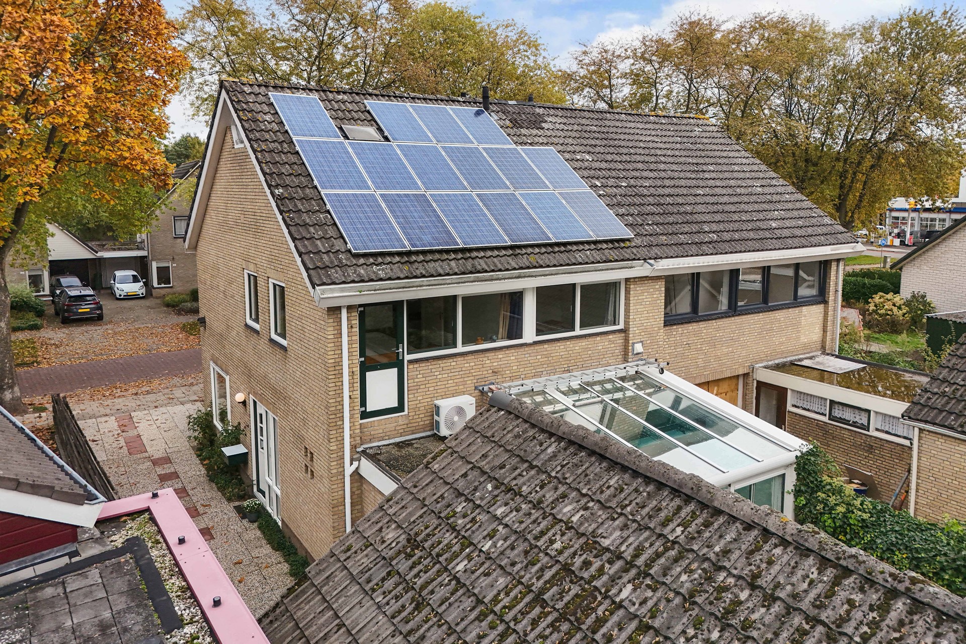 - Vier slaapkamers (waarvan één met toegang tot plat dak met airco-unit)