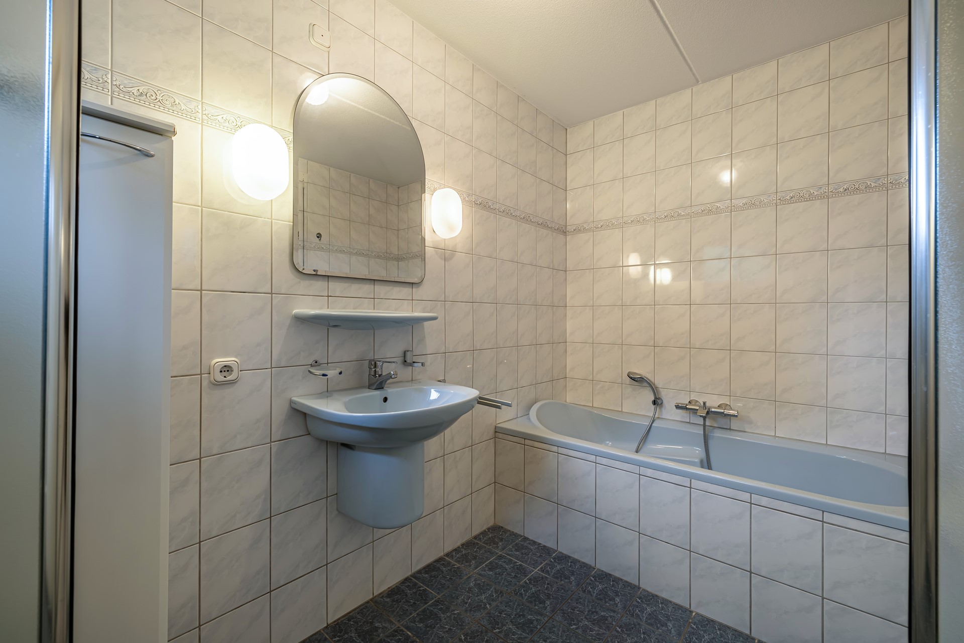 • Badkamer met inloopdouche, ligbad, wastafel en designradiator
