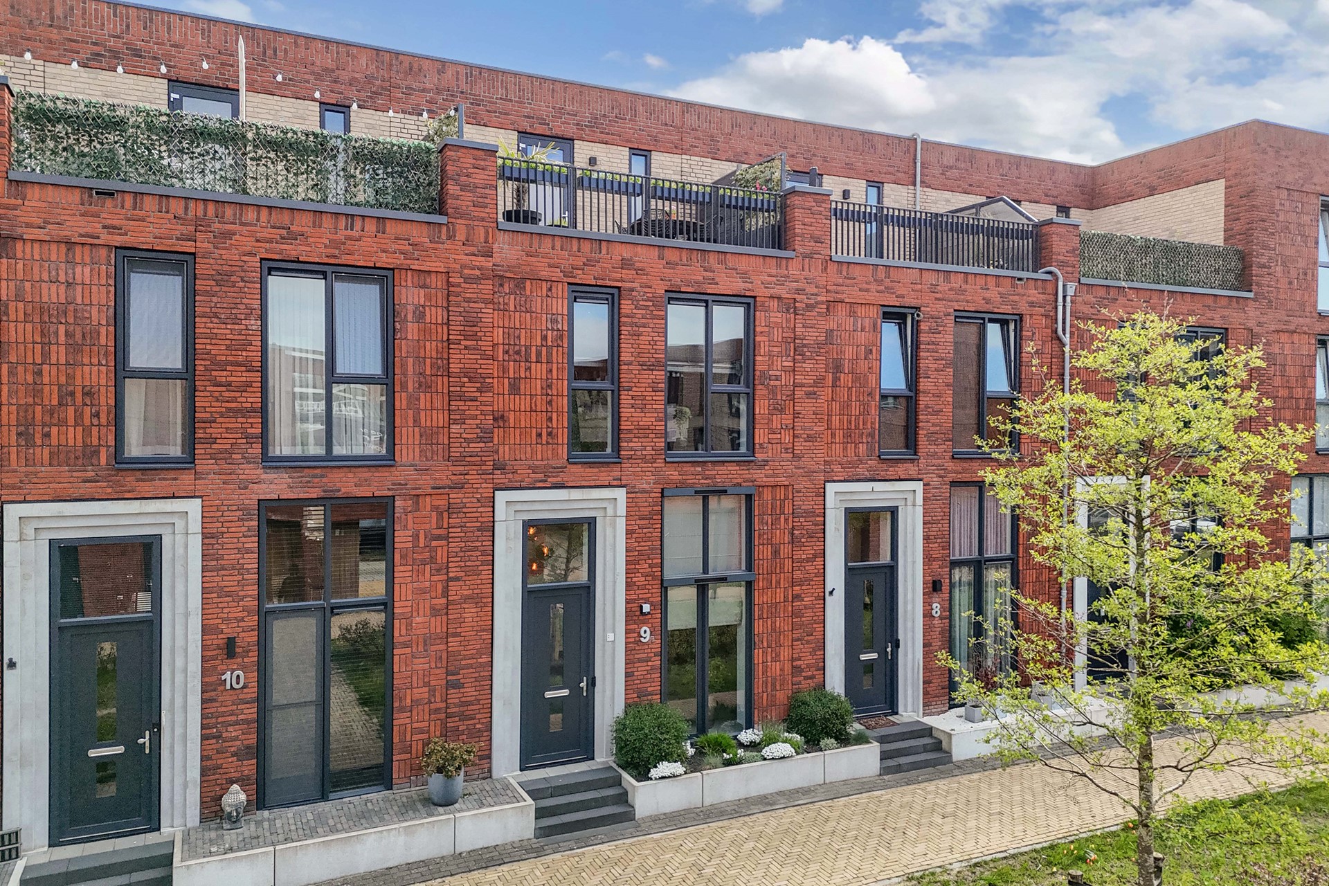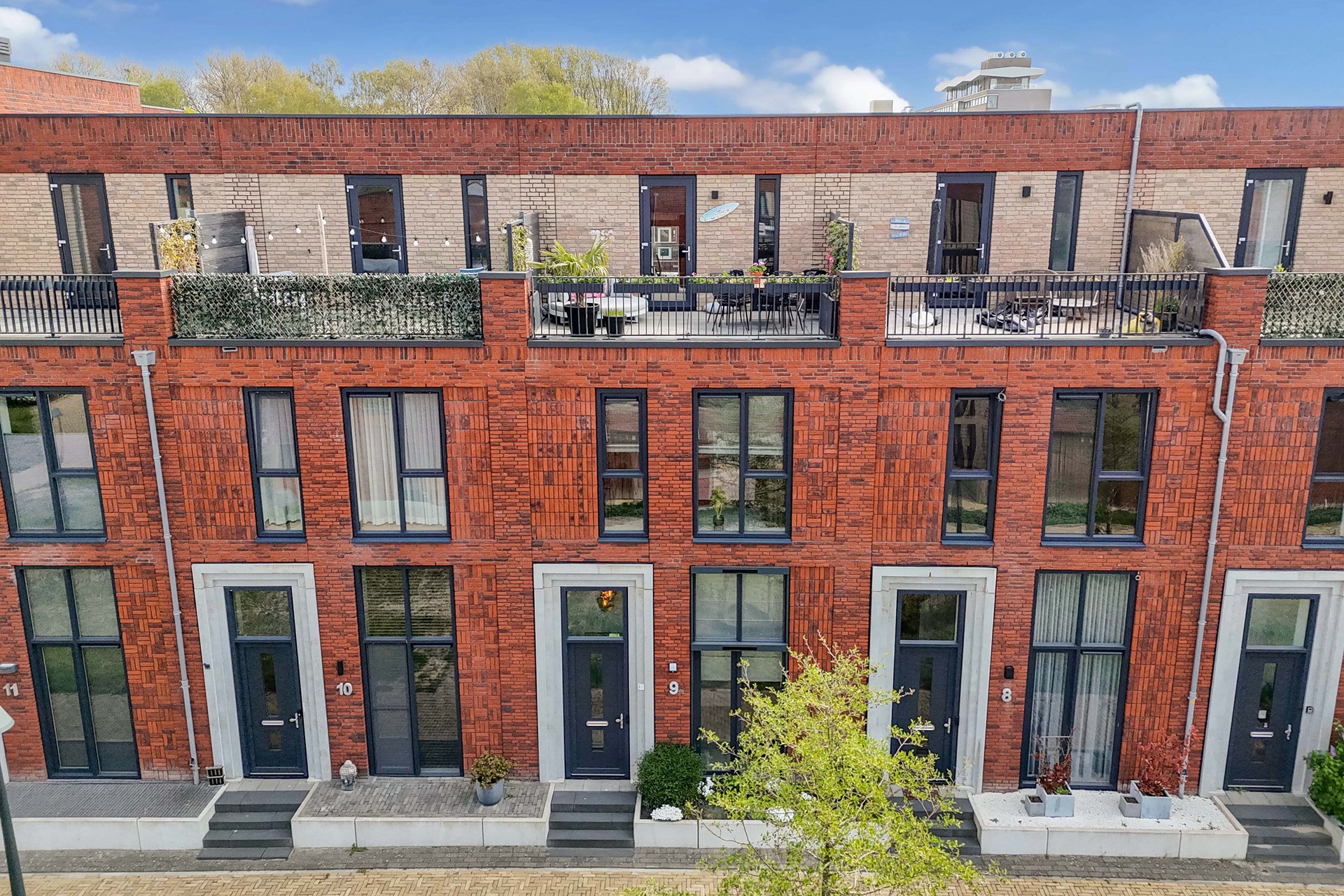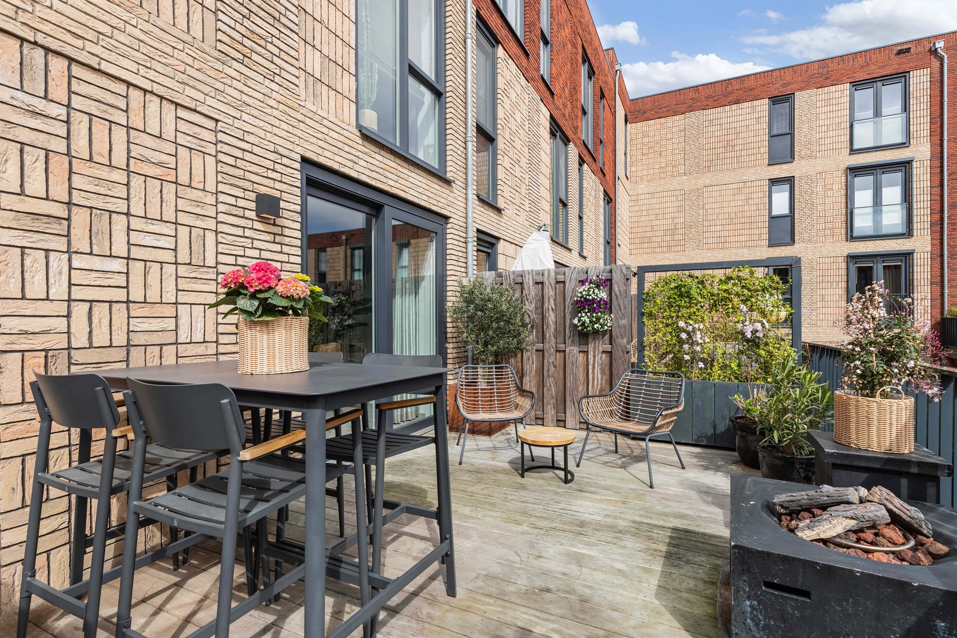 Aan de voorzijde bevindt zich op de begane grond een klein stadstuintje en een dakterras op de tweede verdieping.