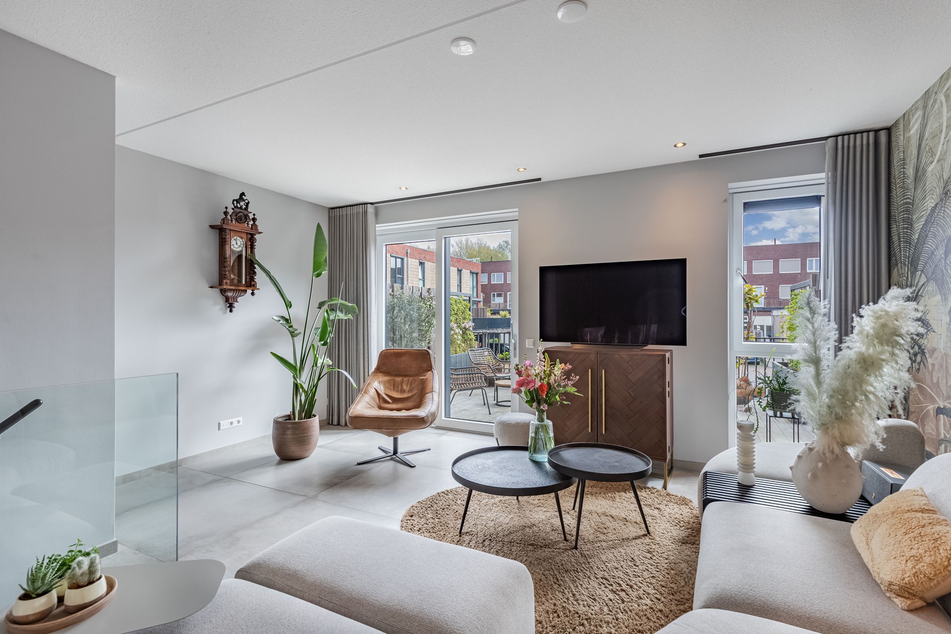 De woonkamer bevindt zich op de ander helft van de splitlevel met een luxe glazen balustrade als afscheiding. Vanuit de woonkamer bereik je ook het eerste terras, deze ligt op het oosten.