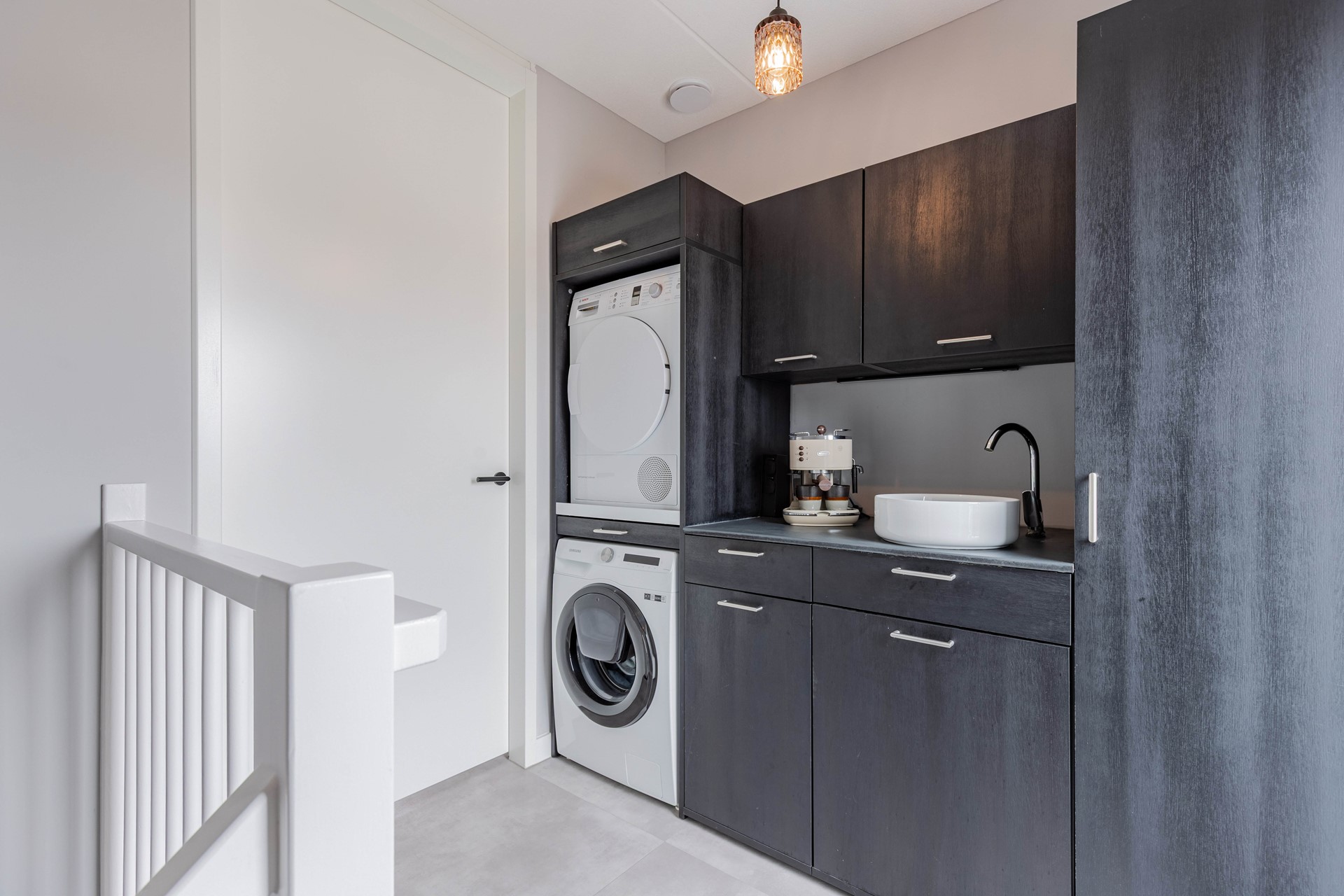 - Overloop met keukenblokje, wasmachine- en drogeropstelling en toegang tot het dakterras