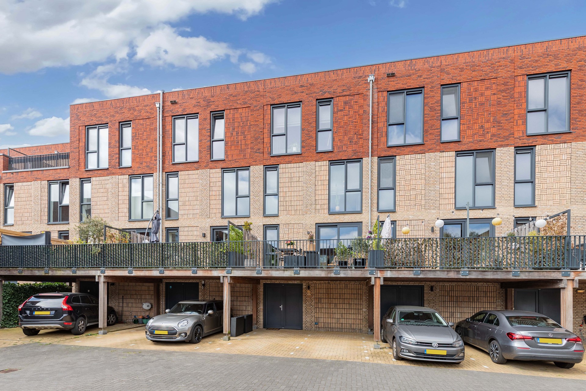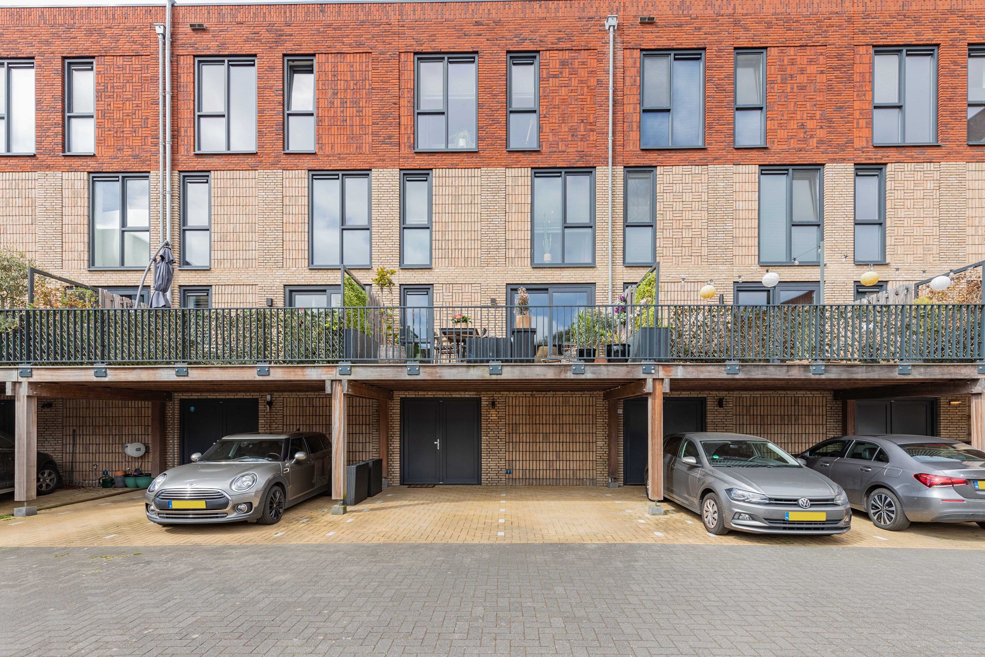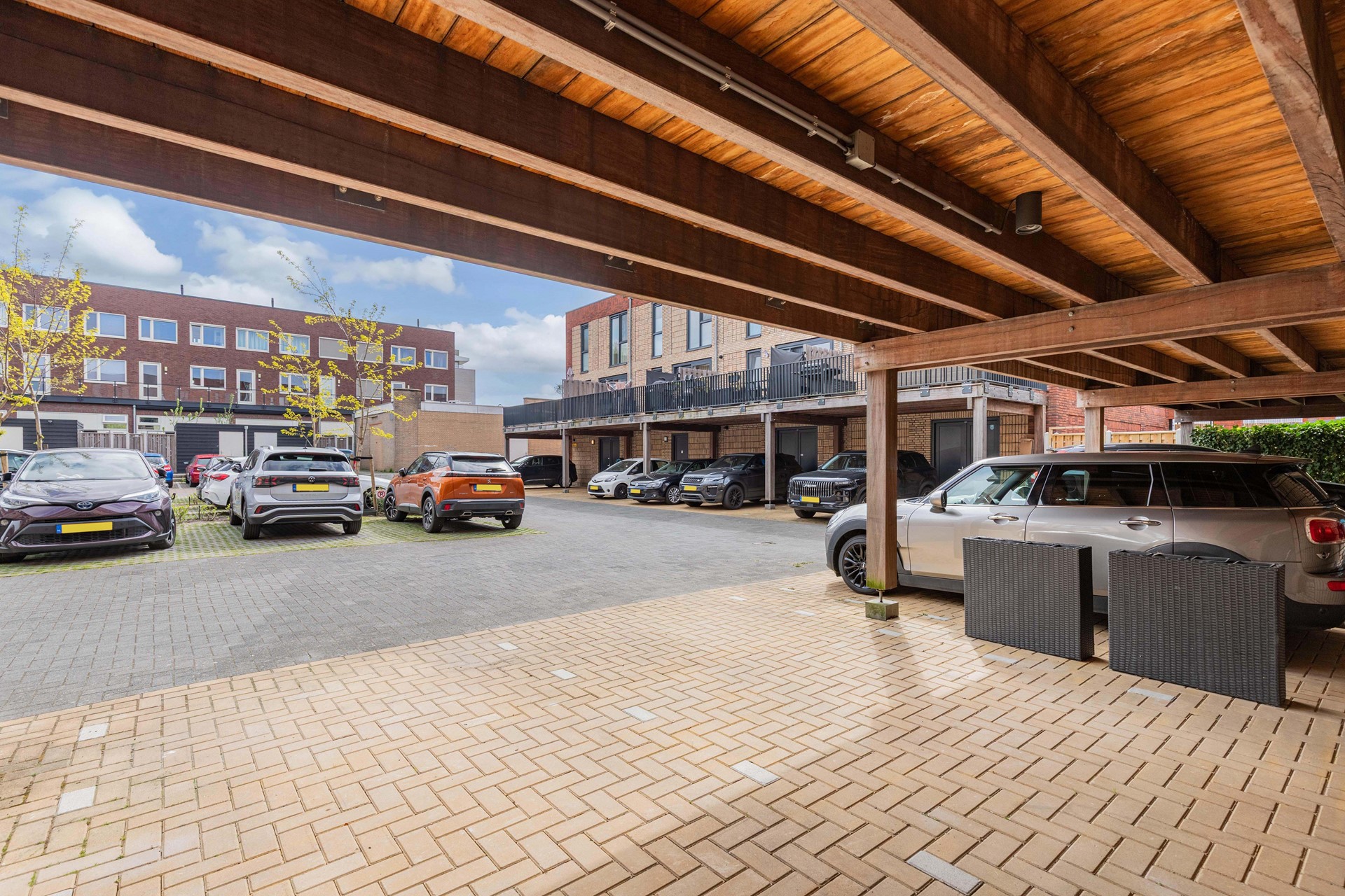 Aan de achterzijde vind je de dubbele carport met 2 parkeerplaatsen op eigen terrein en een terras op het oosten.