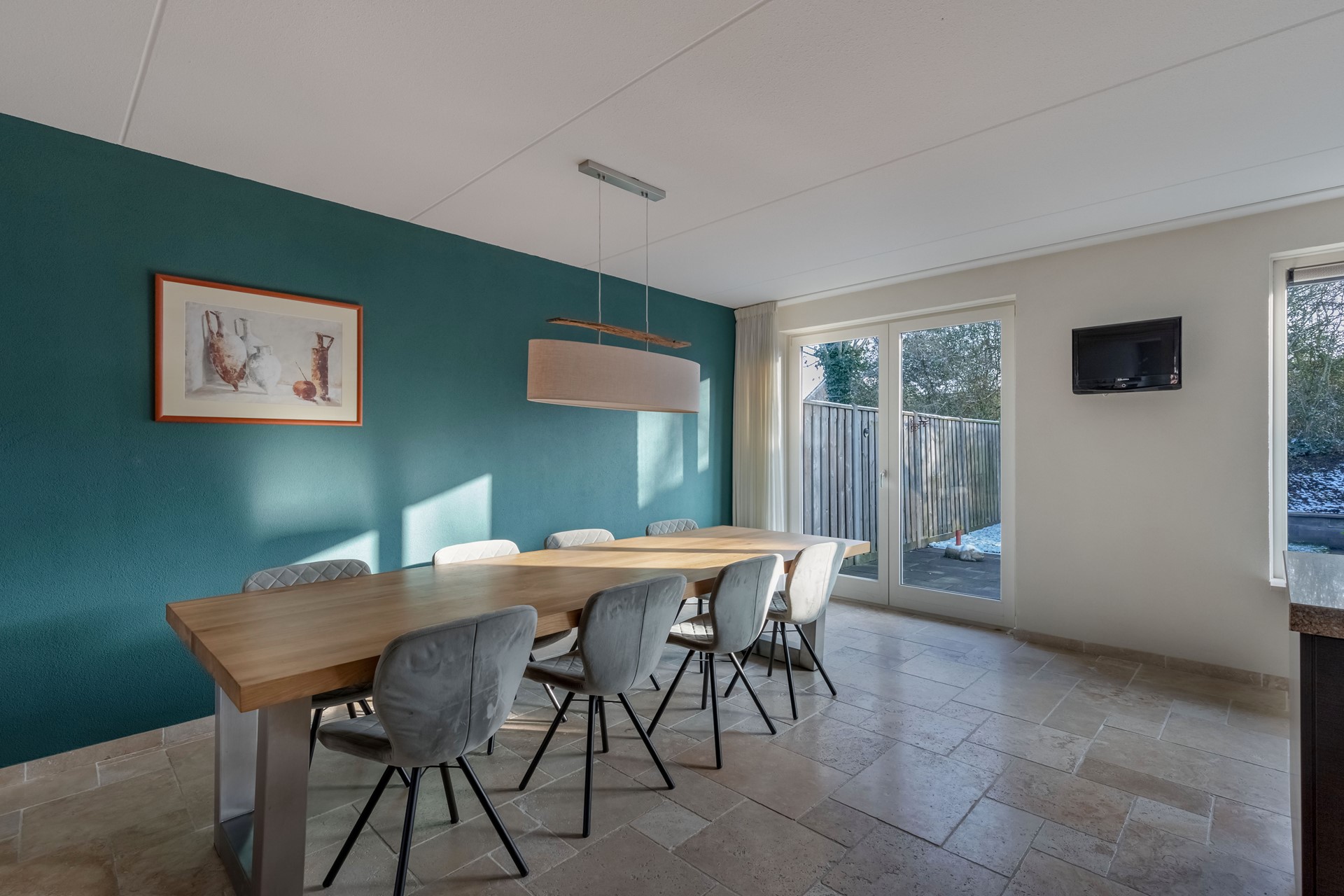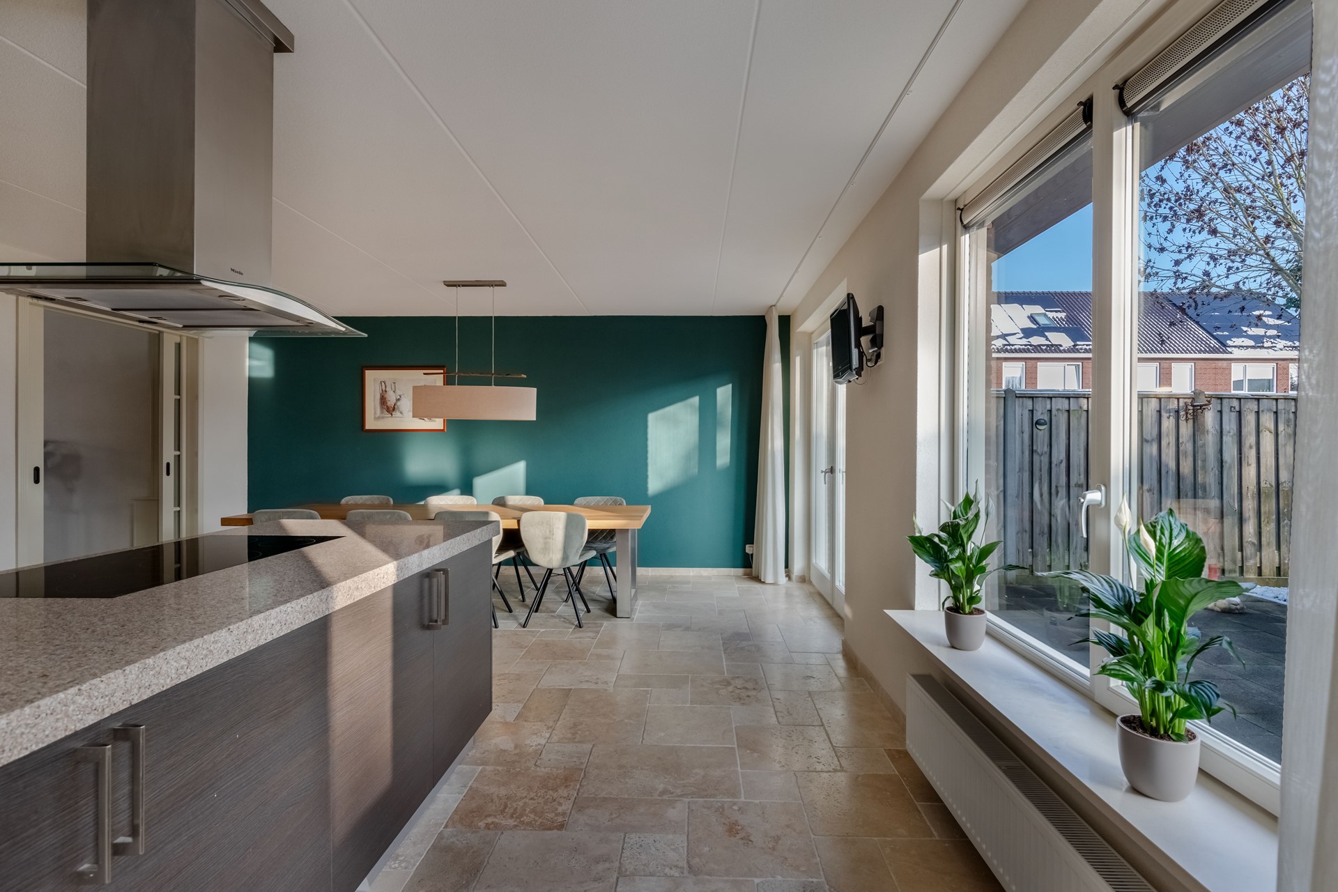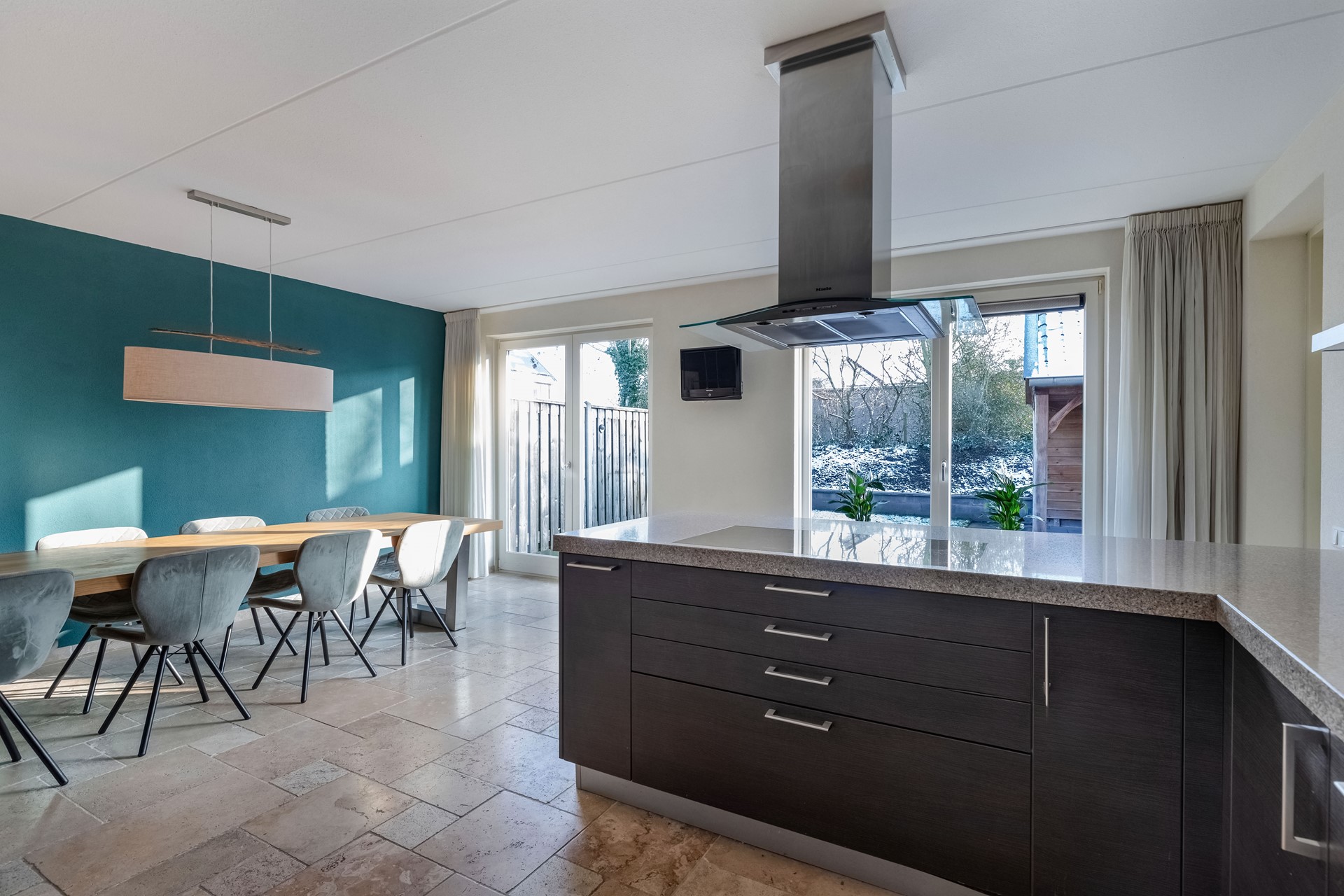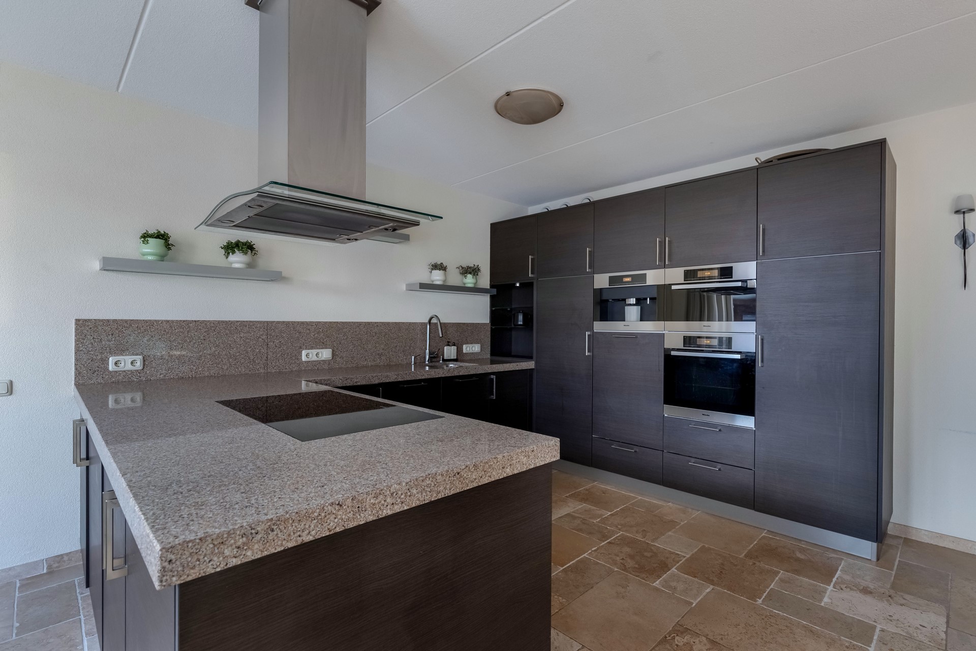 De ruime woonkeuken met grote eethoek vormt het hart van de woning en is ingericht met een uitgebreid aanbod aan inbouwapparatuur, waaronder een oven, stoomoven, vaatwasser, inbouwkoffiezetapparaat en koelkast (Miele). De opstelling biedt volop werk- en kastruimte. Aangrenzend bevindt zich de bijkeuken, praktisch voor voorraad, wasruimte en extra bergruimte.