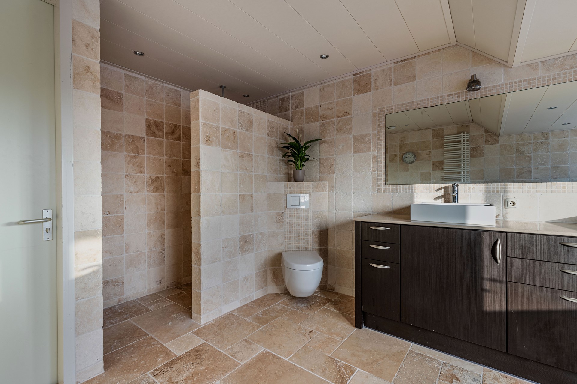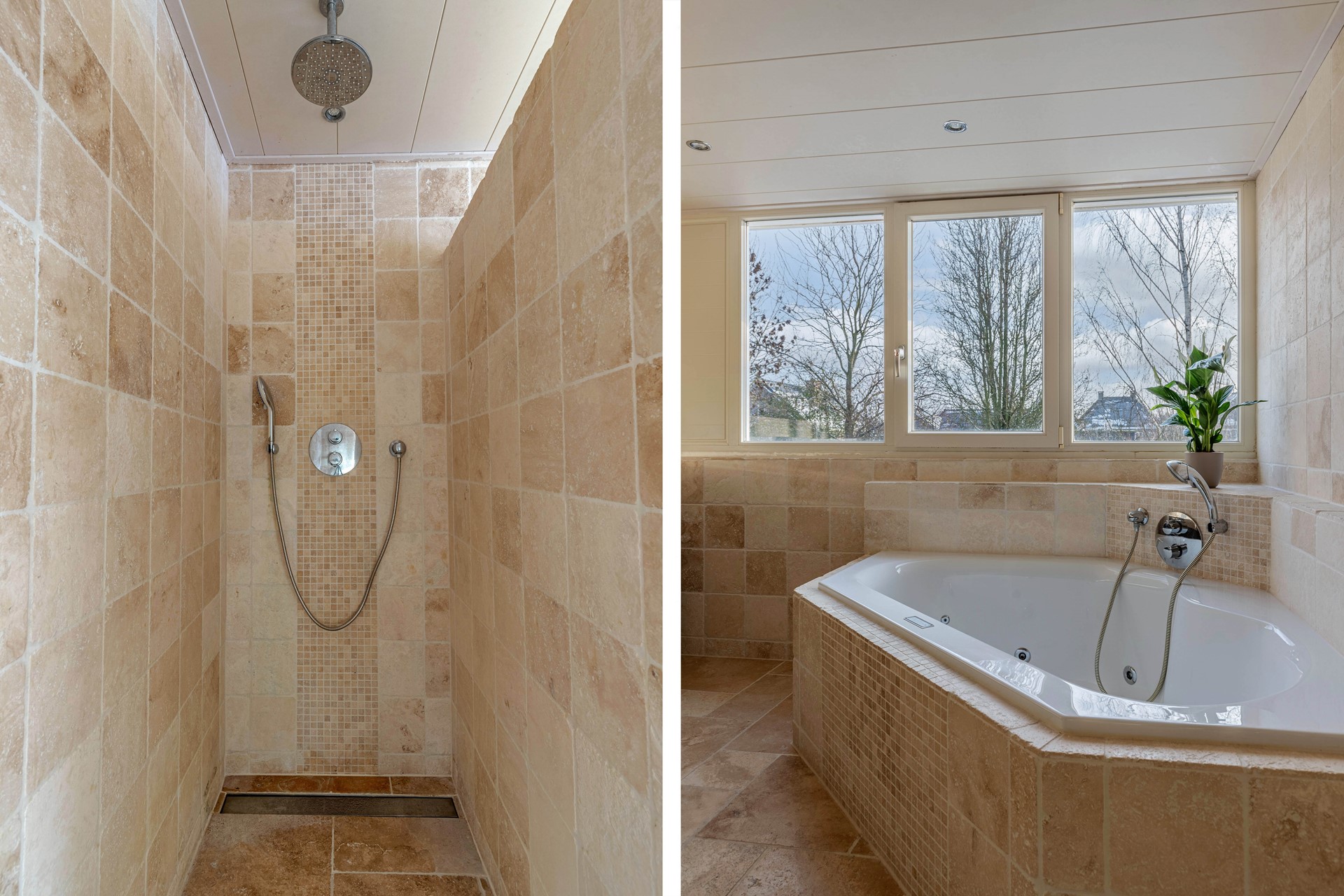 - Badkamer met hoekbad (Whirpool), inloopdouche, toilet, dubbele wastafel met meubel en vloerverwarming